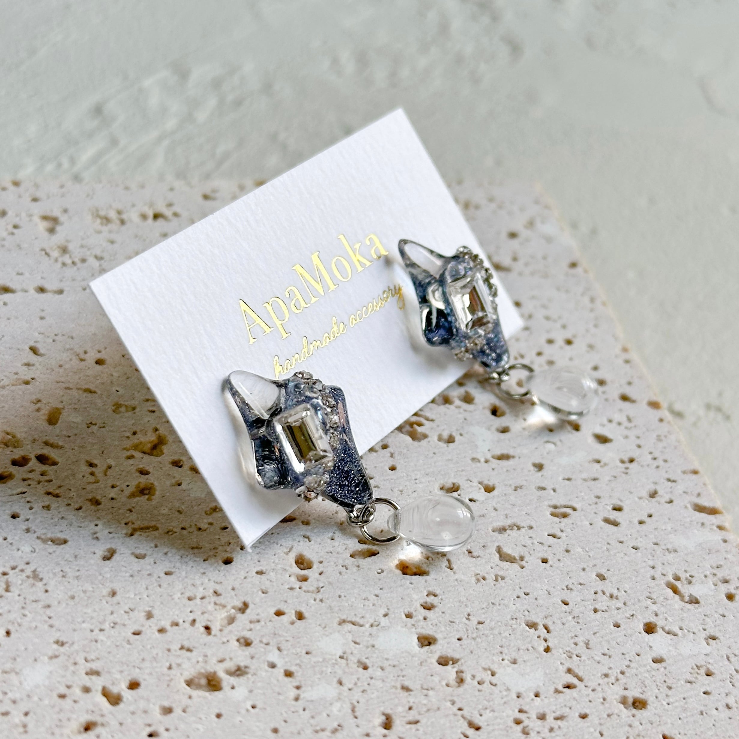 深いブルーにビジューパーツで甘さをプラスしています。